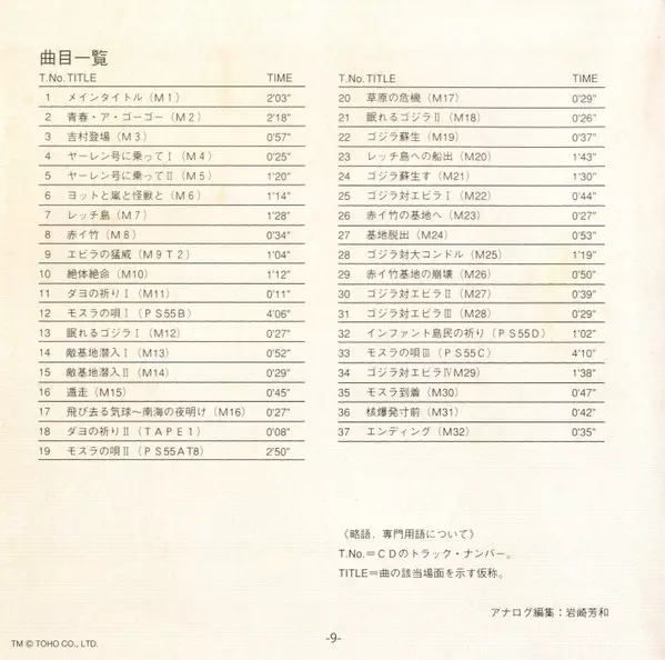 Tytuł | ゴジラ・エビラ・モスラ 南海の大決闘 (オリジナル・サウンドトラック) = Ebirah, Horror Of The Deep (Original Motion Picture Soundtrack) |