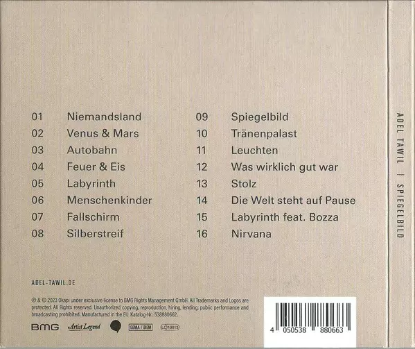 Adel Tawil: Spiegelbild Wersja na CD w standardowe wydanie. Ta konkretna edycja została wydana w Niemcy, Austria i Szwajcaria w wydawnictwie BMG dnia 3. marca 2023. Album można sklasyfikować jako gatunek Pop.