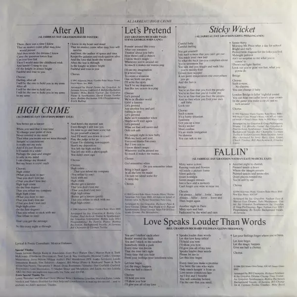 Al Jarreau: High Crime Wersja na winylu LP w standardowe wydanie. Ta konkretna edycja została wydana w Europa w wydawnictwie WEA roku 1984. Album sięga do gatunku Muzyka elektroniczna, Jazz i Soul-Jazz.