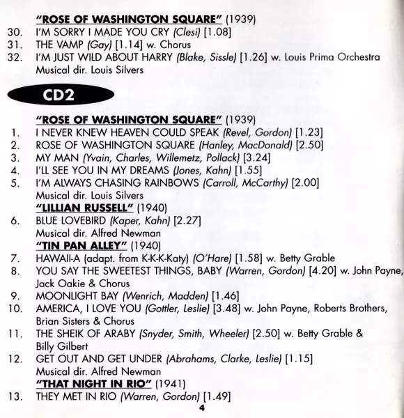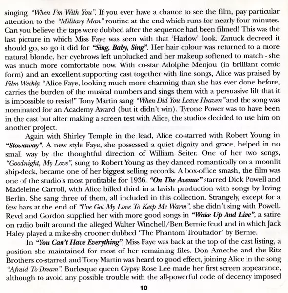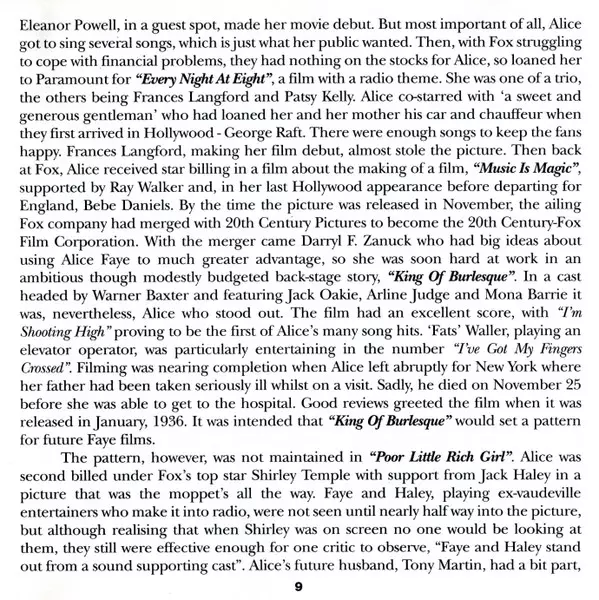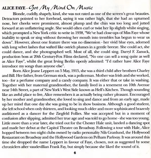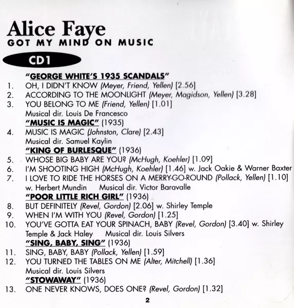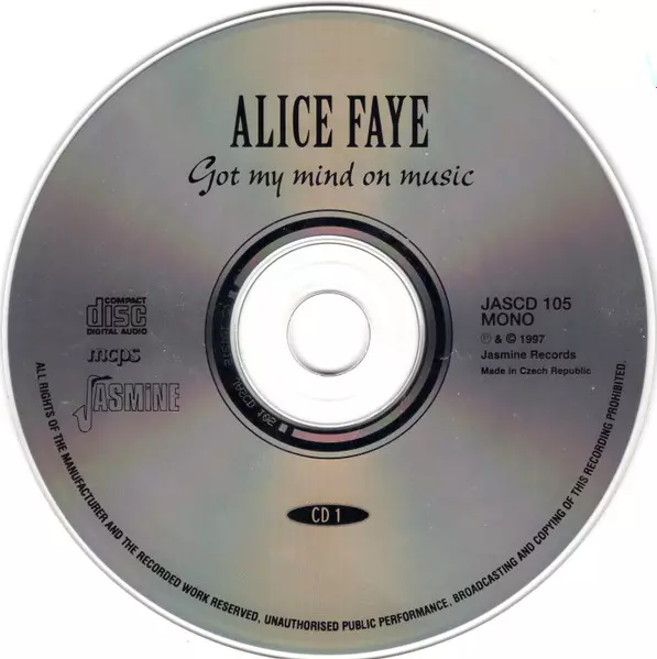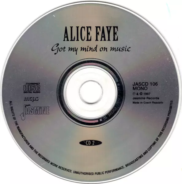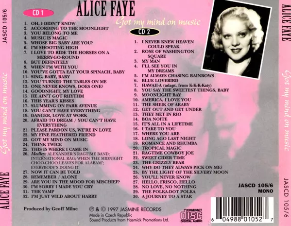 Alice Faye: Got My Mind On Music Wersja na 2CD w standardowe wydanie. Ta konkretna edycja została wydana w WIELKA BRYTANIA w wydawnictwie Jasmine Records dnia 9. grudnia 1997. Album można sklasyfikować jako gatunek Scena i ekran.