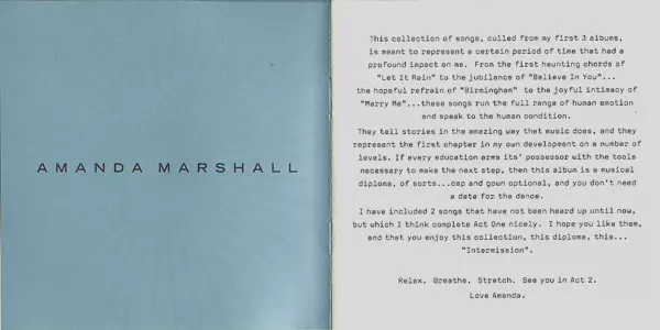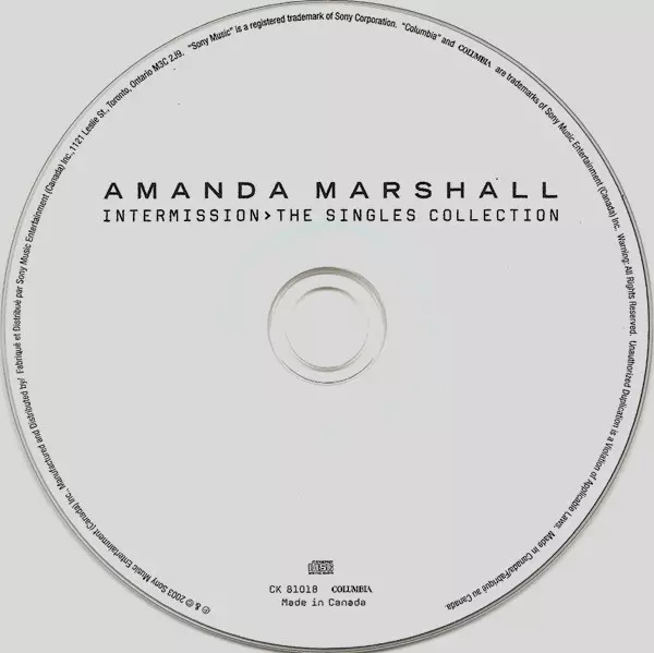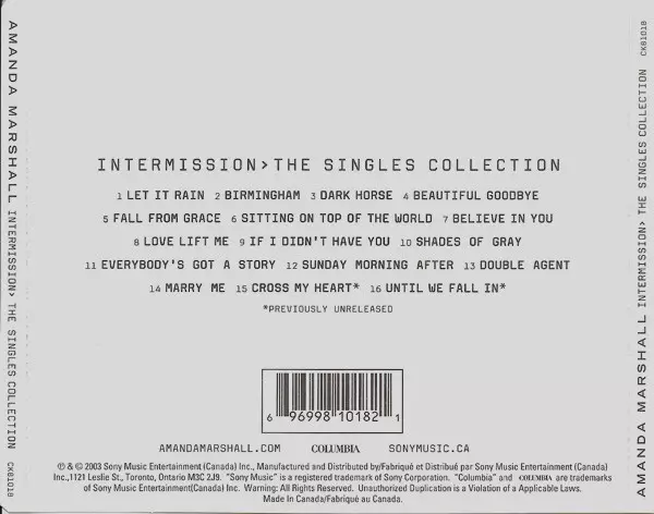 Amanda Marshall: Intermission > The Singles Collection Wersja na CD w standardowe wydanie. Ta konkretna edycja została wydana w Kanada w wydawnictwie Columbia dnia 24. lutego 2004. Album sięga do gatunku Rock, Pop Rock i Soft Rock.