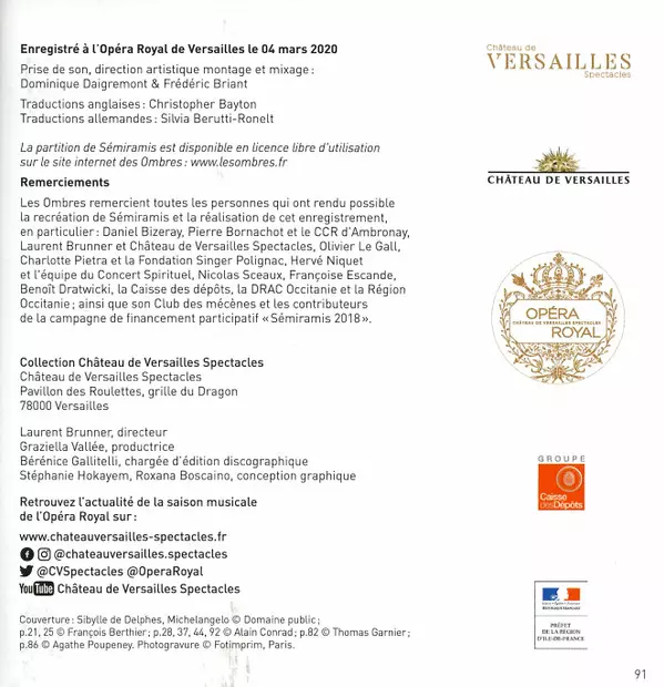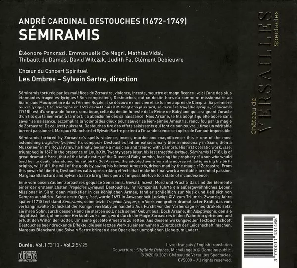 André-Cardinal Destouches: Sémiramis Wersja na 2CD w standardowe wydanie. Ta konkretna edycja została wydana w Europa w wydawnictwie Château de Versailles Spectacles dnia 14. lipca 2021. Album sięga do gatunku Muzyka klasyczna, Muzyka barokowa i Opera.