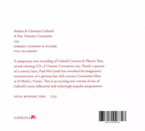 Andrea Gabrieli: A New Venetian Coronation 1595 Wersja na CD w standardowe wydanie. Ta konkretna edycja została wydana w Europa w wydawnictwie Winged Lion dnia 28. czerwca 2012. Album sięga do gatunku Muzyka klasyczna, Muzyka barokowa i Renaissance Music.
