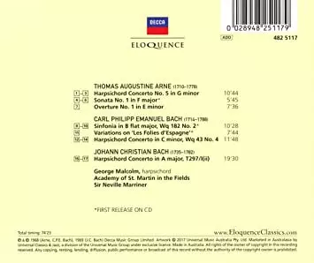 | Wykonawca | Sir Neville Marriner | Carl Philipp Emanuel Bach | Johann Christian Bach | George Malcolm | Thomas Arne |