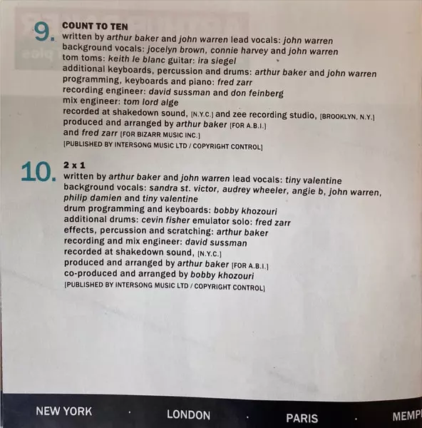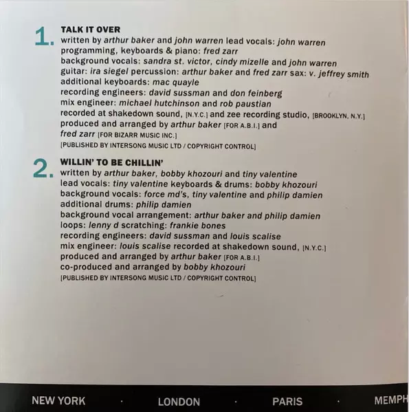 Arranged By, Co-producer Bobby Khozouri | Backing Vocals Angela Brown (4), Audrey Wheeler, John Warren (2), Phillip Damien, Sandra St. Victor, Tiny Valentine | Drum Programming, Keyboards Bobby Khozouri | Drums [Additional Drums] Cevin Fisher | Effects, Percussion, Scratches Arthur Baker | Engineer [Recording And Mix Engineer] David Sussman | Featuring Tiny Valentine | Lead Vocals Tiny Valentine | Producer, Arranged By Arthur Baker | Soloist, Sampler [Emulator], Synthesizer [Emulator] Fred Zarr | Written-By Arthur Baker, John Warren (2)
