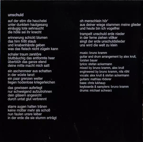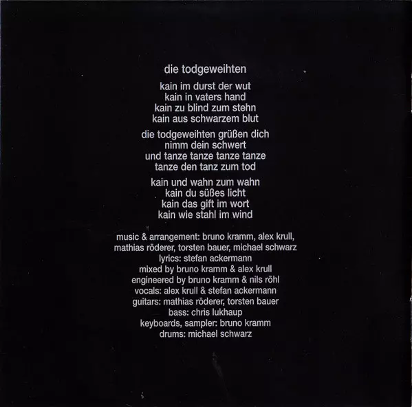 Arranged By, Drums Michael Schwarz | Arranged By, Guitar Mathias Röderer, Thorsten Bauer | Bass Chris Lukhaup | Engineer Nils Röhl | Lyrics By, Vocals Stefan Ackermann | Music By, Arranged By, Mixed By, Engineer, Keyboards, Sampler, Drum Machine Bruno Kramm | Music By, Arranged By, Mixed By, Vocals Alexander Krull