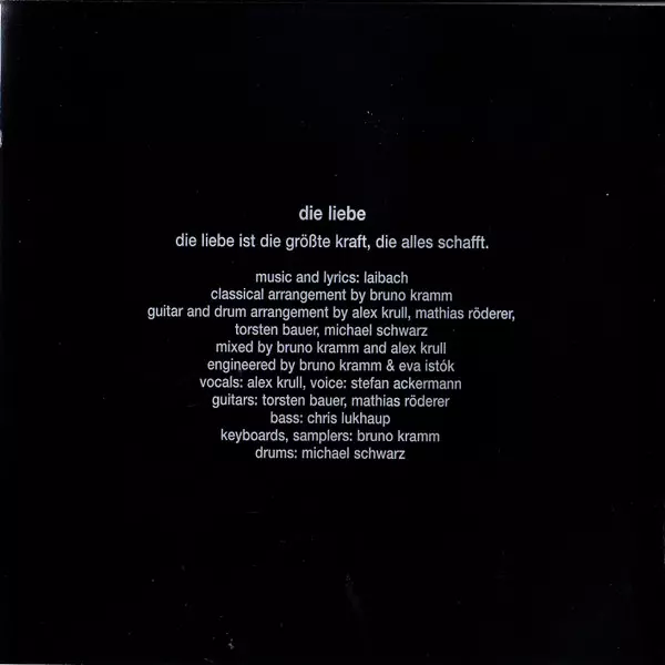 Arranged By, Drums Michael Schwarz | Arranged By, Guitar Mathias Röderer, Thorsten Bauer | Arranged By, Mixed By, Engineer, Keyboards, Sampler Bruno Kramm | Arranged By, Mixed By, Vocals Alexander Krull | Bass Chris Lukhaup | Engineer Eva Istok | Music By, Lyrics By Laibach | Voice Stefan Ackermann