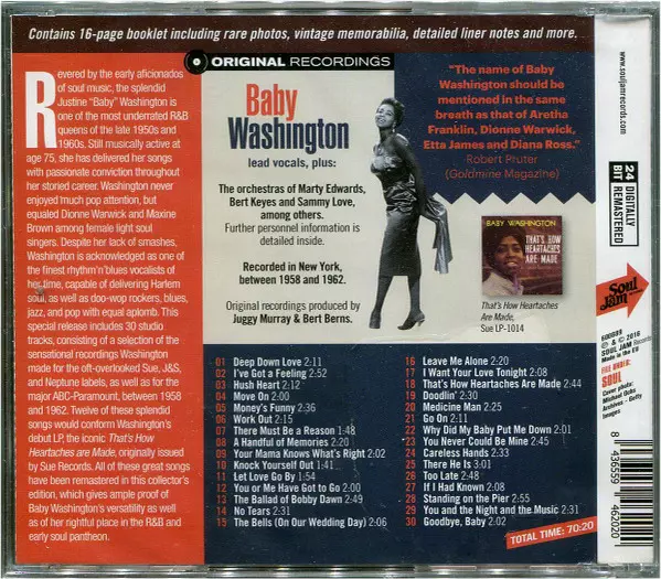 Baby Washington: That's How Heartaches Are Made - 1958-1962 Recordings Wersja na CD w zremasterowane wydanie. Ta konkretna edycja została wydana w Europa w wydawnictwie Soul Jam Records dnia 2. grudnia 2016. Album sięga do gatunku Funk / Soul i Soul.