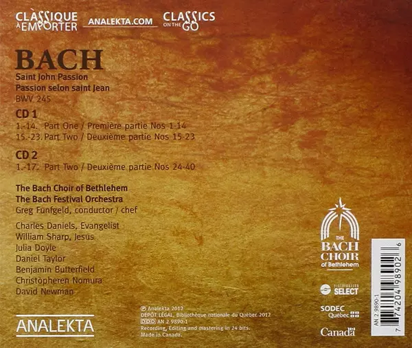 Johann Sebastian Bach: Saint John Passion = Passion Selon Saint Jean Wersja na 2CD w standardowe wydanie. Ta konkretna edycja została wydana w Kanada w wydawnictwie Analekta roku 2014. Album sięga do gatunku Muzyka klasyczna, Muzyka barokowa i Oratorio.