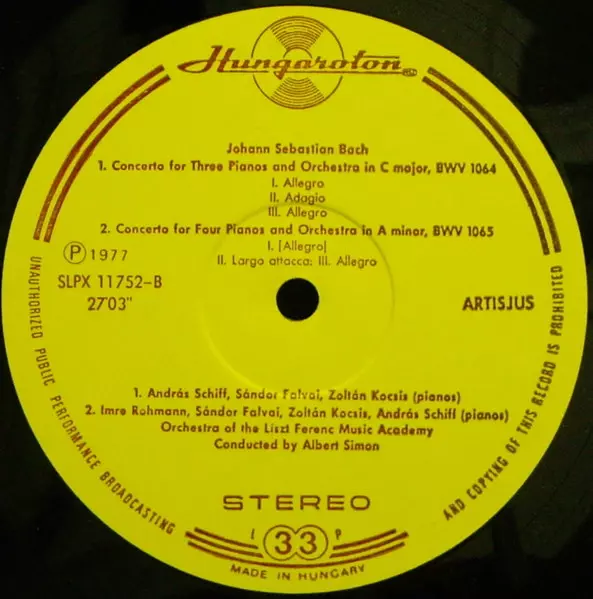 Wykonawca | Johann Sebastian Bach | Liszt Ferenc Chamber Orchestra | András Schiff | Zoltán Kocsis | Albert Simon | Kovács Lóránt | István Matuz | Imre Rohmann | Sándor Falvai |