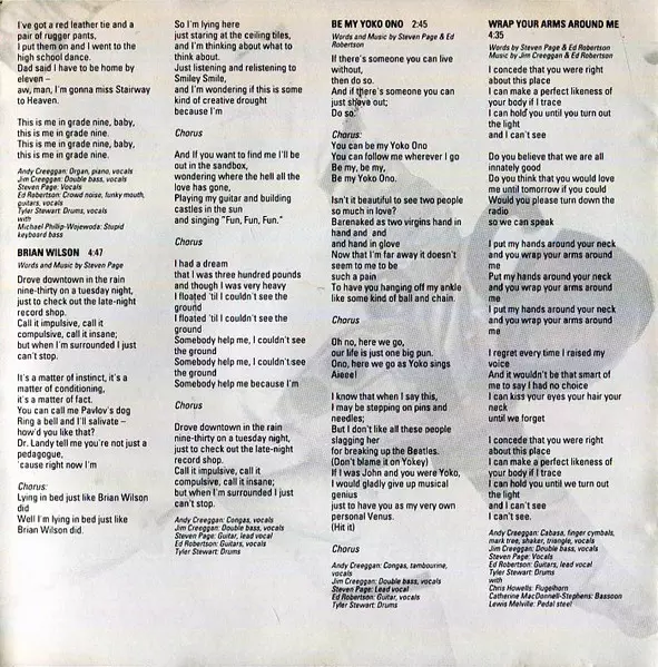 Alto Saxophone, Baritone Saxophone Nic Gotham | Claves, Congas, Guiro, Piano, Vibraphone, Vocals Andy Creeggan | Cowbell, Guitar, Vocals Ed Robertson | Double Bass, Vocals Jim Creeggan | Drums Tyler Stewart | Lead Vocals Steven Page | Tenor Saxophone Gene Hardy | Words By, Music By Steven Page