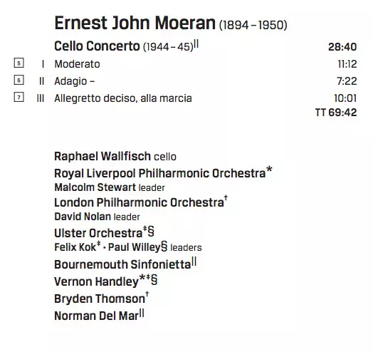 | Wykonawca | Arnold Bax | Raphael Wallfisch | Gerald Finzi | Arthur Bliss | Ernest John Moeran |