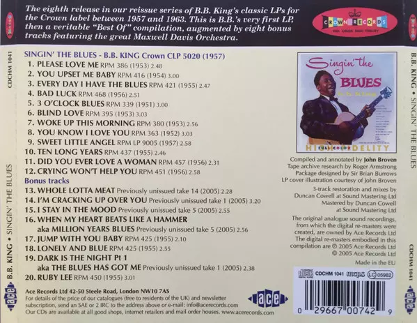 B.B. King: Singin' The Blues Wersja na CD w zremasterowane wydanie. Ta konkretna edycja została wydana w WIELKA BRYTANIA w wydawnictwie Ace dnia 19. kwietnia 2005.