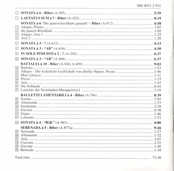 | Tytuł | Sonate À 3, À 4, À 6, Laetatus Sum, Sonata À 6 "Die Pauern Kirchfartt Genandt", In Sole Postuisti, Battalia, Balletti Lamentabili, Serenada À 5 |