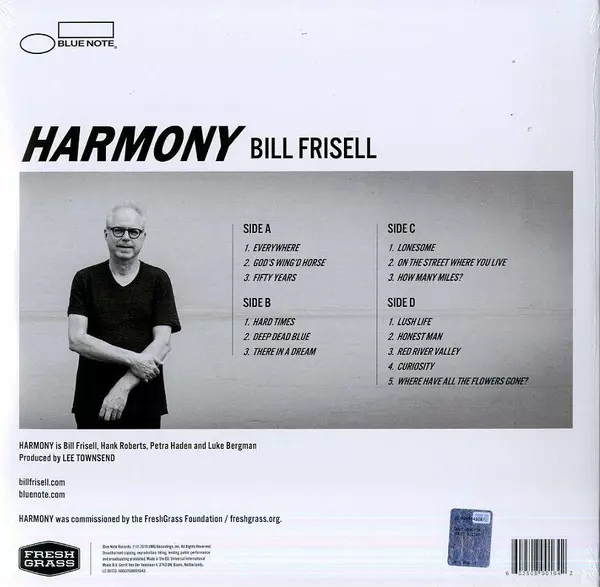 Bill Frisell: Harmony Wersja na winylu 2LP w standardowe wydanie. Ta konkretna edycja została wydana w Europa w wydawnictwie Blue Note dnia 8. listopada 2019. Album sięga do gatunku Jazz i Contemporary Jazz.