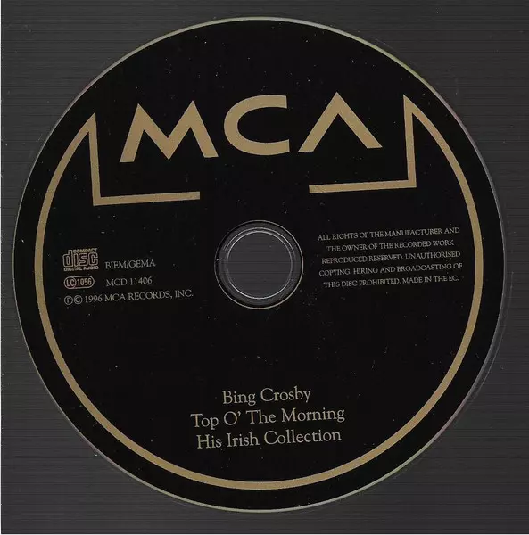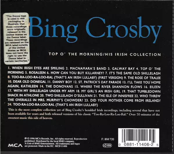 Bing Crosby: Top O' The Morning / His Irish Collection Wersja na CD w standardowe wydanie. Ta konkretna edycja została wydana w Europa w wydawnictwie MCA Records dnia 27. lutego 1996. Album sięga do gatunku Pop i Wokal.