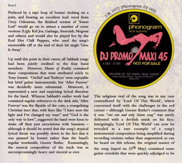 Wszystko, co obecnie nazywa się doom lub stoner metalem, prawdopodobnie zaczęło się tutaj. Gitarzysta Tommi Iommi stroi swoją gitarę, aby ułatwić sobie grę. Trzy półtony w dół, znajduje "bardziej masywne i cięższe brzmienie" i zmusza basistę Geezera Butlera do zrobienia tego samego. Rezultat rezonuje z pokoleniami muzyków - czy to Nirvana, Sound...