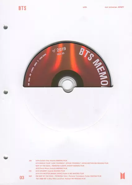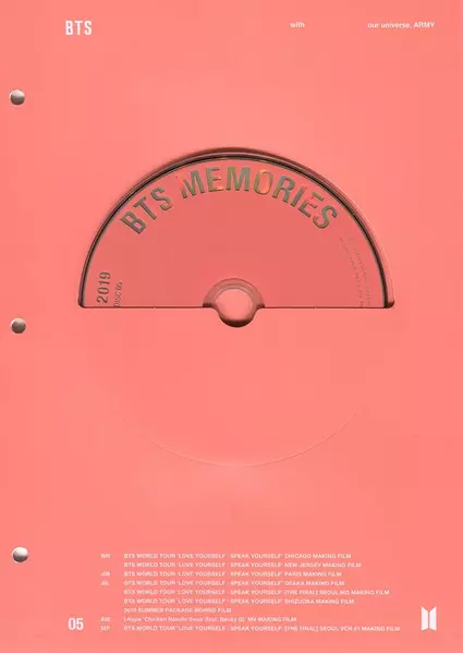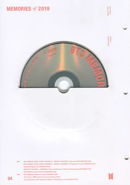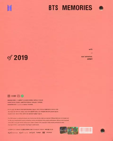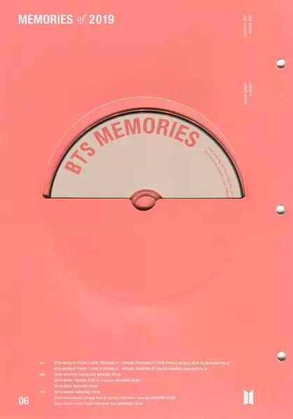 BTS: Memories Of 2019 Wersja na 6DVD w standardowe wydanie. Ta konkretna edycja została wydana w Korea Południowa w wydawnictwie Big Hit Entertainment we współpracy z Play Company Corp. dnia 21. sierpnia 2020. Album sięga do gatunku Pop, Scena i ekran, K-pop i Concert Film.