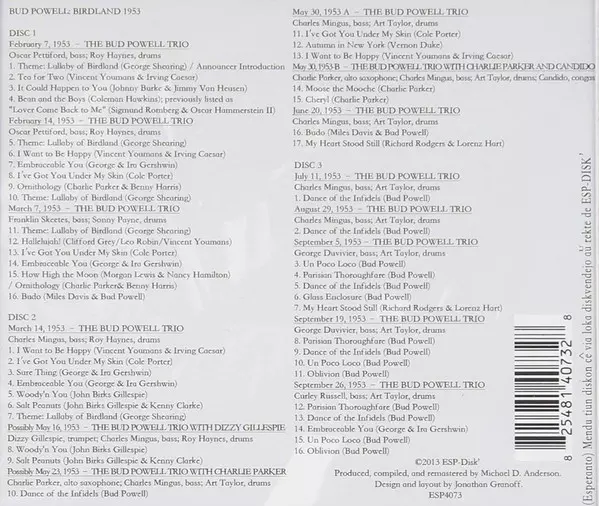 Bud Powell: Birdland 1953 Wersja na 3CD w zremasterowane wydanie. Ta konkretna edycja została wydana w USA w wydawnictwie ESP Disk dnia 17. września 2015. Album sięga do gatunku Jazz i Bop.