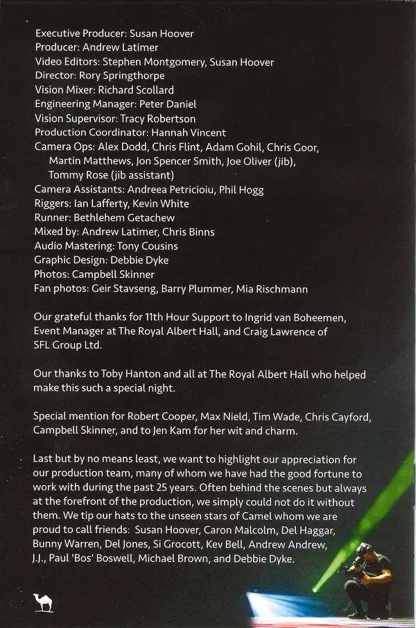 Product Information The long-awaited video of Camel 's performance at the Royal Albert Hall on 17 September 2018. The band played the full Moonmadness and other classics. The band Camel formed in 1971 and achieved international success in the mid-1970s with the albums The Snow Goose (1975) and Moonmadness (1976).