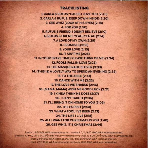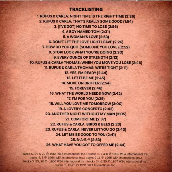 | 1-1 | Carla Thomas, Rufus Thomas: 'Cause I Love You | 2:43 min | |