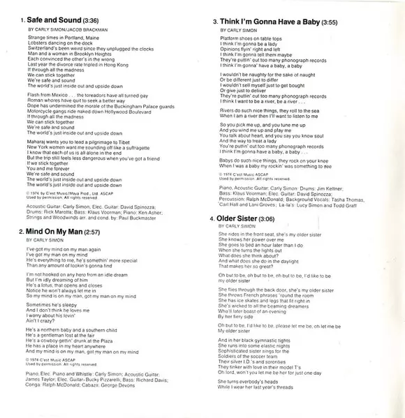 Backing Vocals [Background Vocals] Carl Hall, Lani Groves, Tasha Thomas | Bass Klaus Voormann | Drums Jim Keltner | Electric Guitar [Elec. Guitar] David Spinozza | Percussion Ralph MacDonald | Piano, Acoustic Guitar Carly Simon | Vocals [La-la's] Lucy Simon, Todd Graff