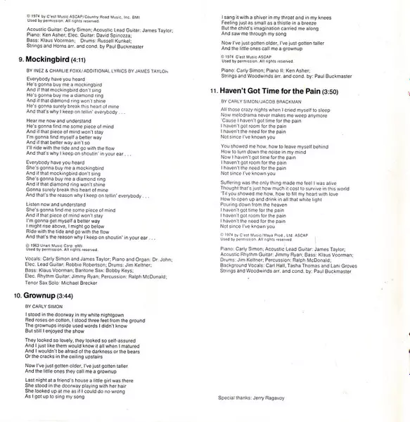 Acoustic Guitar [Acoustic Lead Guitar] James Taylor (2) | Acoustic Guitar [Acoustic Rhythm Guitar] Jimmy Ryan (3) | Arranged By [Strings And Woodwinds Arr. By], Conductor [Strings And Woodwinds Cond. By] Paul Buckmaster | Backing Vocals [Background Vocals] Carl Hall, Lani Groves, Tasha Thomas | Bass Klaus Voormann | Drums Jim Keltner | Percussion Ralph MacDonald | Piano Carly Simon | Written-By Jacob Brackman