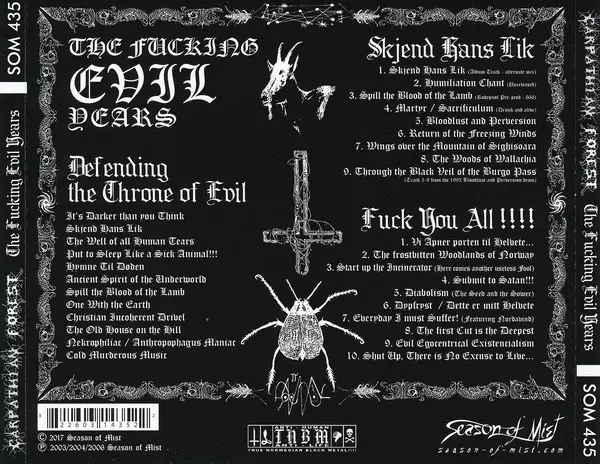 Carpathian Forest: The Fucking Evil Years Wersja na 3CD/Zestaw pudełkowy w standardowe wydanie. Ta konkretna edycja została wydana w Europa w wydawnictwie Season Of Mist dnia 8. grudnia 2017. Album sięga do gatunku Rock i Black Metal.