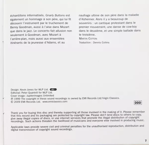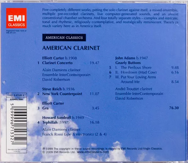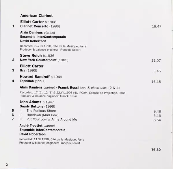 | Wykonawca | Steve Reich | John Adams | Ensemble Intercontemporain | Elliott Carter | David Robertson | Howard Sandroff | Alain Damiens | André Trouttet |