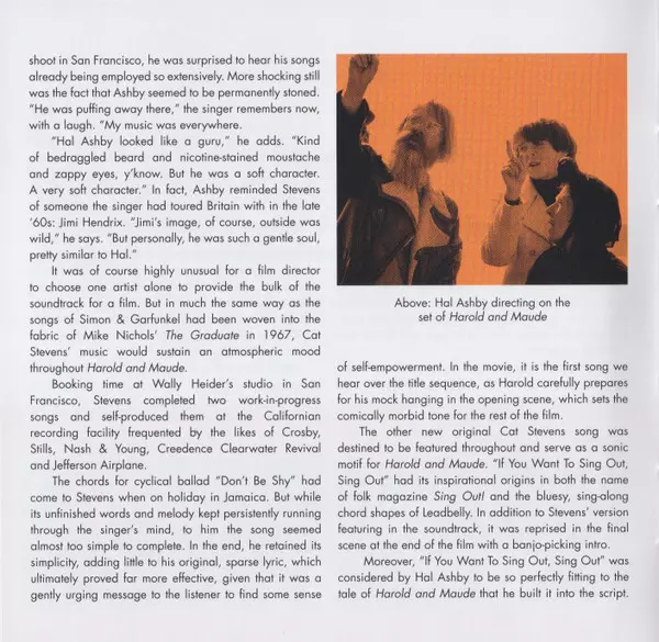 Film Hala Ashby'ego z 1971 roku Harold i Maude był prawdopodobnie pierwszą czarną komedią w Hollywood. Z fabułą obracającą się wokół platonicznej historii miłosnej między nastolatkiem (Harold Chasen, grany przez Buda Corta) i ośmiolatką (Dame Marjorie Chardin, grana przez Ruth Gordon), film miał swoje trudności. Jednak 50 lat po premierze kinowej jest to prawdziwy kultowy klasyk. Sukces filmu jest w dużej mierze zasługą ścieżki dźwiękowej, która składa się wyłącznie z piosenek autorstwa Cat Stevens. Reżyser Hal Ashby zmontował film słuchając piosenek Mona Bone Jakon i Tea for the Tillerman i był przekonany, że jego film powinien zawierać wyłącznie materiał Cat Stevens. Po szeroko zakrojonej kampanii udało mu się pozyskać Cat Stevens. Siedem piosenek z dwóch albumów Island / A&M z 1970 roku znalazło się na ścieżce dźwiękowej: "On The Road To Find Out", "I Wish, I Wish", "Miles From Nowhere", "Tea for the Tillerman", "I Think I See The Light", "Trouble" i "Where Do The Children Play?". W miksie znalazły się również dwa utwory spoza albumu: "Don't Be Shy" i to, co stało się nieoficjalnym motywem przewodnim filmu, "If You Want To Sing Out, Sing Out". Piosenki te pozostały niewydane aż do kolekcji Footsteps In The Dark z 1984 roku, a później zostały włączone do zestawu pudełkowego On The Road To Find Out z 2001 roku. Aby uczcić 50. rocznicę premiery filmu, wydano nowy 180g 1LP Harold and Maude (Original Motion Picture Soundtrack). Po raz pierwszy zawiera dziewięć oryginalnych piosenek z Cat Stevens, a także dodatkowe dialogi i muzykę instrumentalną z filmu. Wcześniej nieodkryte mastery audio dla "Don't Be Shy" i "If You Want To Sing Out, Sing Out" zostały odkryte w archiwum Island Records, a cały dźwięk został zremasterowany w światowej sławy Abbey Road Studios. Nowy Harold and Maude (Original Motion Picture Soundtrack) będzie miał ulepszone opakowanie z notatkami i zdjęciami (szczegóły nie są jeszcze znane w momencie oddania do druku).