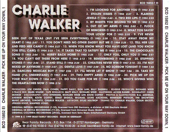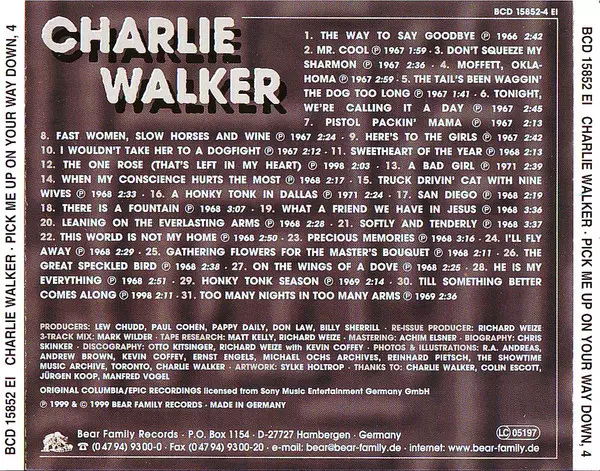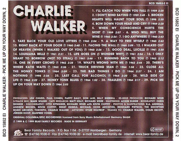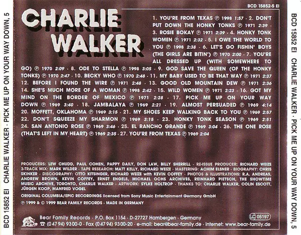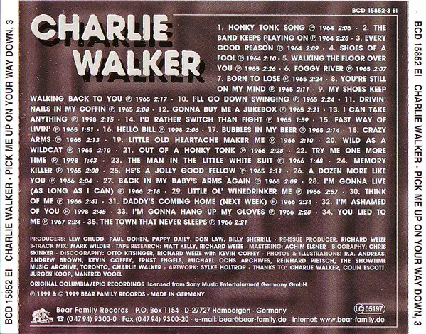 Charlie Walker: Pick Me Up On Your Way Down Wersja na 5CD/Zestaw pudełkowy w standardowe wydanie. Ta konkretna edycja została wydana w Niemcy w wydawnictwie Bear Family Records roku 2000. Album sięga do gatunku Folk, World, & Country i Country.