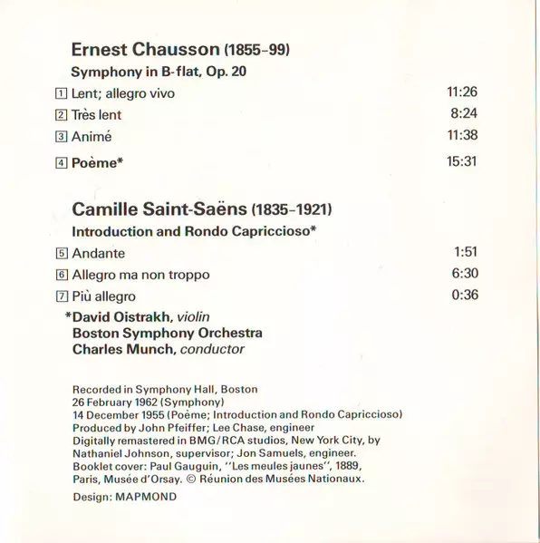 | Wykonawca | Boston Symphony Orchestra | Camille Saint-Saëns | David Oistrach | Charles Munch | Ernest Chausson |