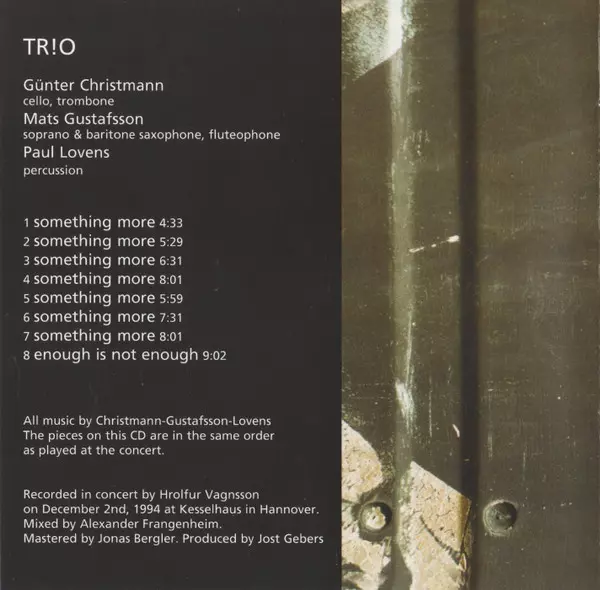 | Wykonawca | Mats Gustafsson | Paul Lovens | Günter Christmann | TR!O |