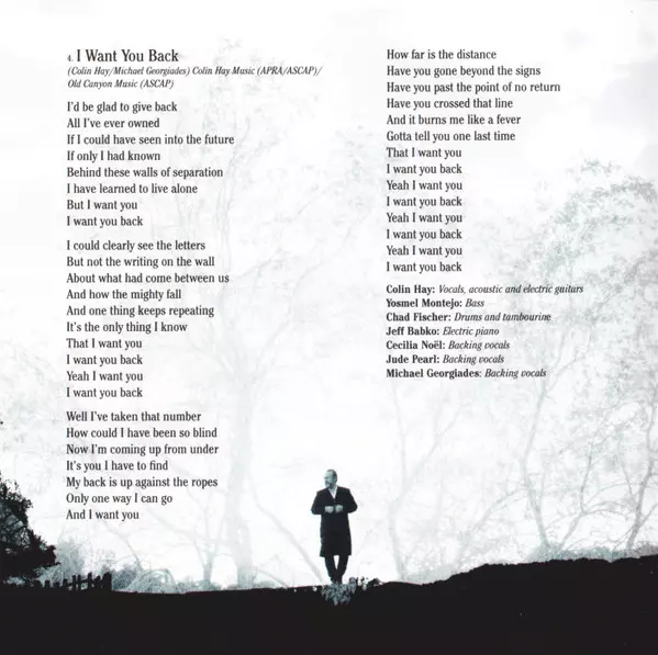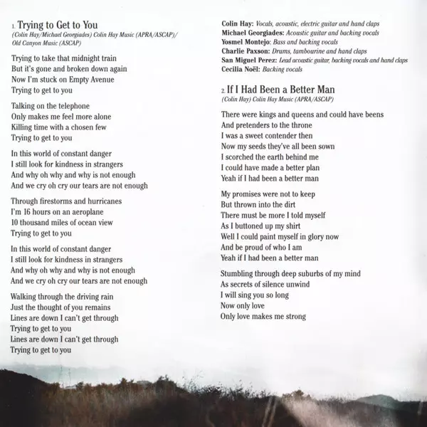 Acoustic Guitar [Lead], Backing Vocals, Handclaps San Miguel Perez | Acoustic Guitar, Backing Vocals Michael Georgiades | Backing Vocals Cecilia Noël | Bass, Backing Vocals Yosmel Montejo | Drums, Tambourine, Handclaps Charlie Paxson | Vocals, Acoustic Guitar, Electric Guitar, Handclaps Colin Hay