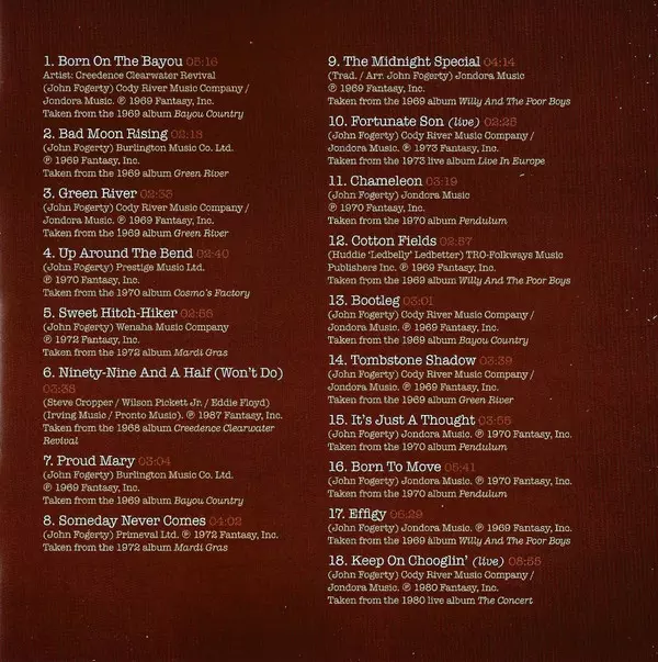 This collection of greatest hits at an affordable price is now also available in Germany. Including all the hits like "Proud Mary", "Up Around The Bend" and the #1 hit "Bad Moon Rising".
