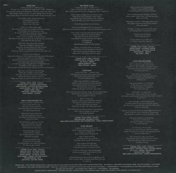 Arranged By [Strings] Crosby & Nash, Joel Bernstein, Mike Lewis (7) | Bass George "Chocolate" Perry | Drums, Timpani, Percussion Joe Vitale | Piano, Words By, Music By Graham Nash | Vocals Crosby, Stills & Nash