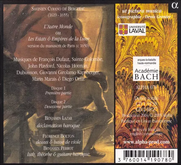 Florence Bolton: L'Autre Monde, Ou Les Estats & Empires De La Lune Wersja na 2CD w standardowe wydanie. Ta konkretna edycja została wydana w Francja w wydawnictwie Alpha Productions dnia 18. lutego 2011. Album sięga do gatunku Muzyka klasyczna, Non-Music, Muzyka barokowa i Monolog.