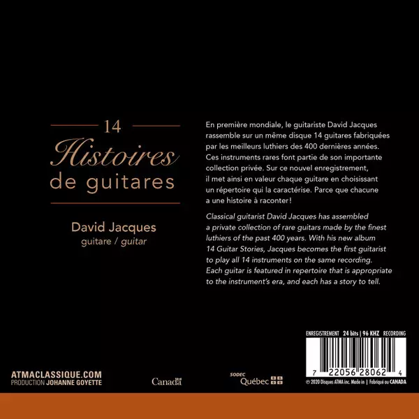 David Jacques: 14 Histoires de Guitares DIGI Wersja na CD w digipack wydanie. Ta konkretna edycja została wydana w Kanada w wydawnictwie Atma Classique dnia 29. maja 2020. Album sięga do gatunku Muzyka klasyczna i Muzyka latynoska.