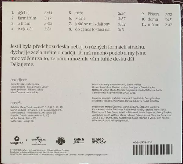 Album Dýchej je završením pozoruhodné a nenapodobitelné hudební cesty Davida Stypky. Charismatický písničkář ze severu Moravy připravil jedenáct autorských písní, z nichž čiší naděje a chuť do života. Dokončili ho zpěvákovi spoluhráči a přátelé ze skupiny Bandjeez s producentem Martinem Ledvinou.