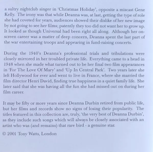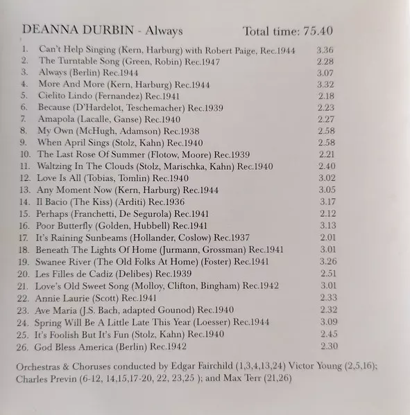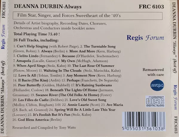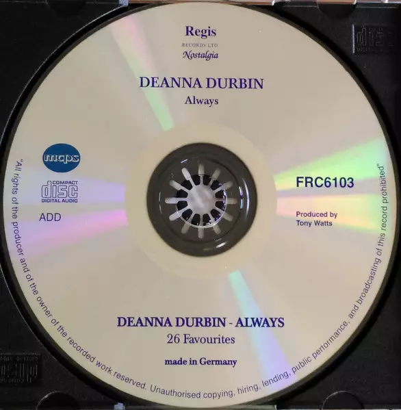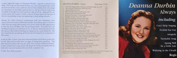 Deanna Durbin: Always Wersja na CD w zremasterowane wydanie. Ta konkretna edycja została wydana w Niemcy w wydawnictwie Forum (12). Album sięga do gatunku Pop, Muzyka klasyczna, Scena i ekran i Modernism.
