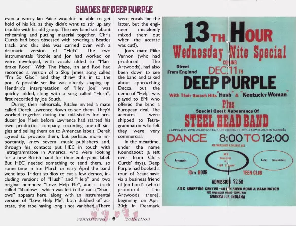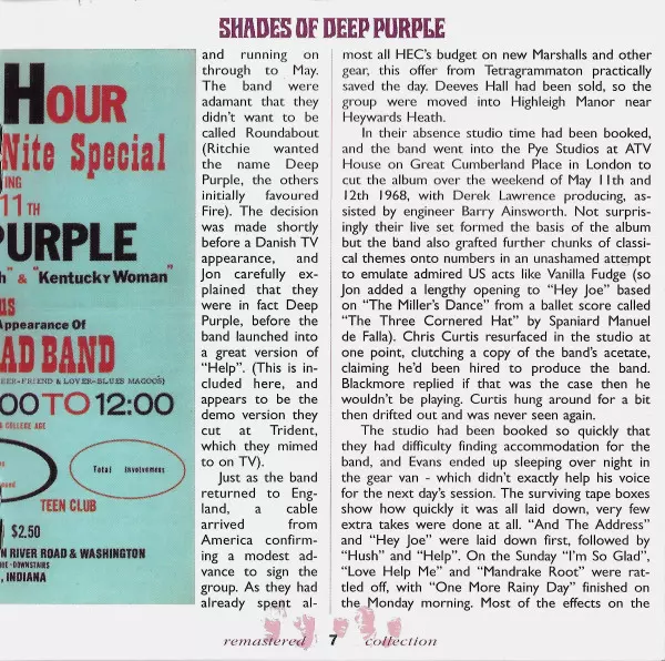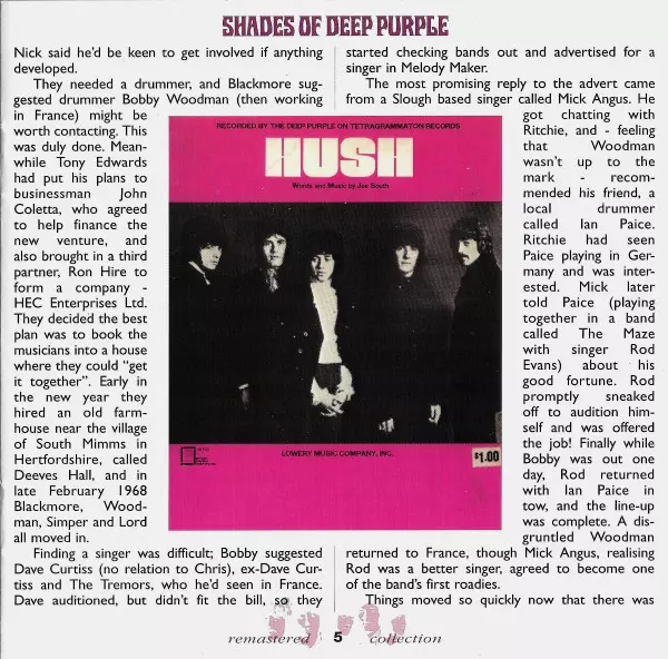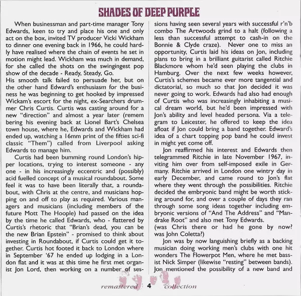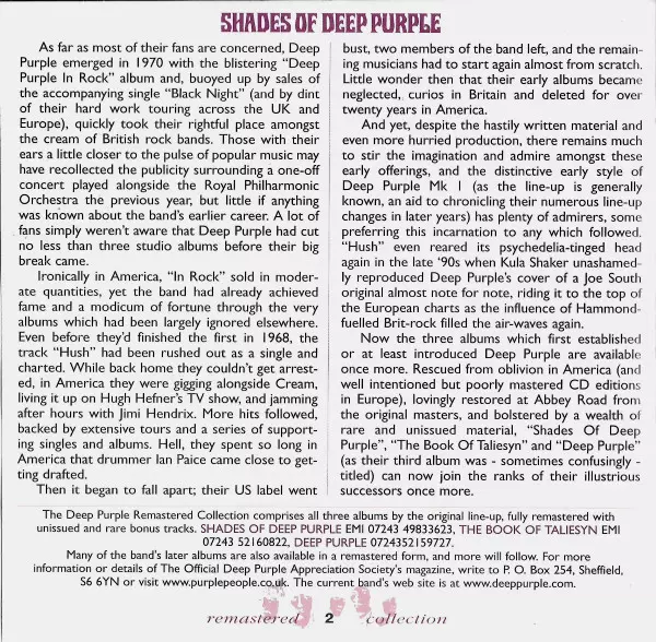 Pierwszy album Deep Purple powstał w ciągu krótkiego weekendu w maju 1968 r. Piosenki musiały być nagrane na żywo i w punkt, ponieważ były tylko cztery ścieżki nagraniowe - żaden problem dla zgranych muzyków studyjnych. Shades Of Deep Purple został wydany 17 lipca 1968 roku i doczekał się nawet pierwszego singlowego przeboju Hush.