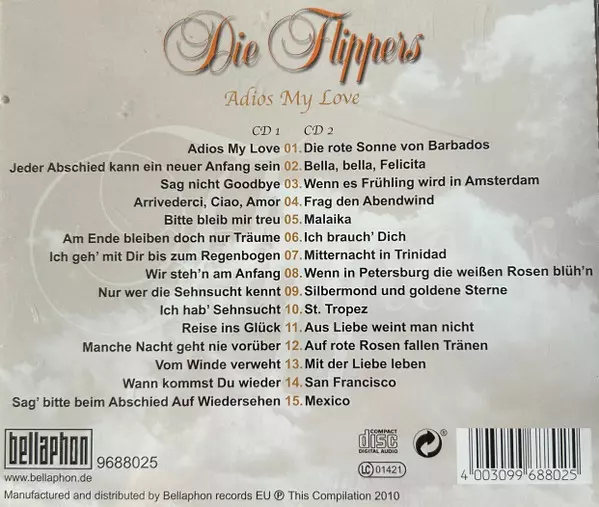 Die Flippers: Adios My Love Wersja na 2CD w standardowe wydanie. Ta konkretna edycja została wydana w Niemcy w wydawnictwie Bellaphon dnia 24. września 2010. Album sięga do gatunku Pop i Szlagiery.