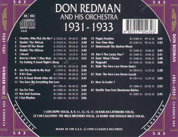 Don Redman And His Orchestra: 1931-1933 Wersja na CD w standardowe wydanie. Ta konkretna edycja została wydana w Francja w wydawnictwie Classics (11) dnia 19. listopada 1996. Album sięga do gatunku Jazz, Big Band i Swing.
