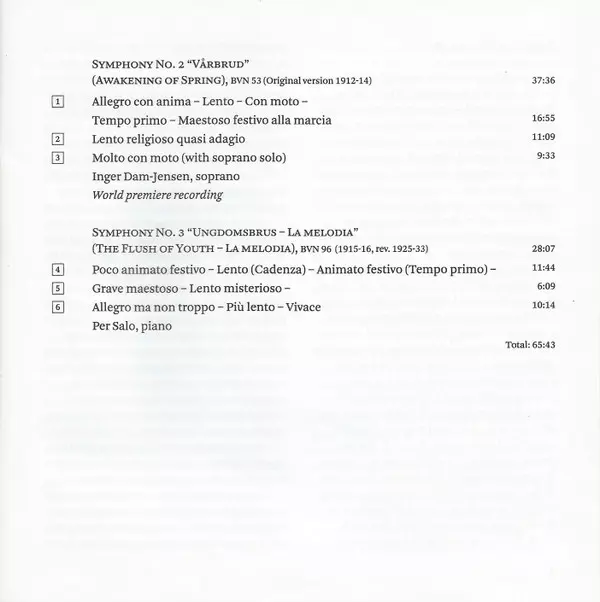 | Symphony No. 3, "Ungdomsbrus - La Melodia" BVN 96 (The Flush Of Youth - La Melodia, 1915-16, Rev. 1925-33) | 28:07 min |