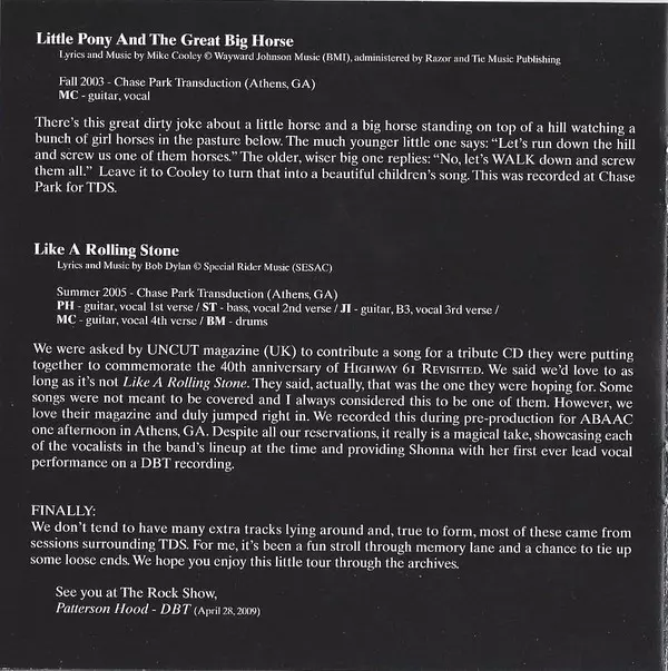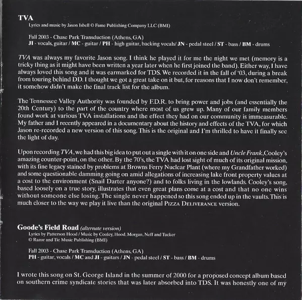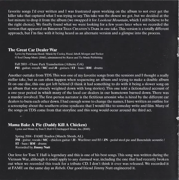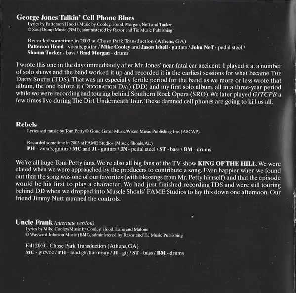 Acoustic Guitar, Pedal Steel Guitar [Pedal Steel Pie] John Neff | Bass Shonna Tucker | Drums Brad Morgan | Electric Piano, Organ [Hammond] Jason Isbell | Guitar [chicken] Mike Cooley | Guitar, Vocals Patterson Hood | Lyrics By, Music By Tom T. Hall | Recorded By Jimmy Nutt