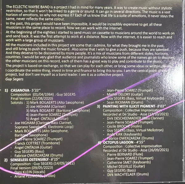 Arranged By Guy Segers | Bass Clarinet Dirk Descheemaeker | Bass, Mellotron Guy Segers | Composed By Eclectic Maybe Band | Drums Fabrice Owerzarzak | Keyboards Andy Kirk (2) | Trumpet Jean-Pierre Soarez | Violin Cécile Broché