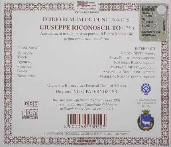 | Wykonawca | Egidio Romualdo Duni | Vito Paternoster | Nicola Sette | Assia Polito | Rossella Ressa | Maria Palmitesta | Antonella Rondinone | Marilena Notarstefano | Orchestra Barocca Del Festival Duni Di Matera |