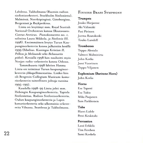 | Wykonawca | Hannu Lintu | Einojuhani Rautavaara | Finnish Brass Symphony |