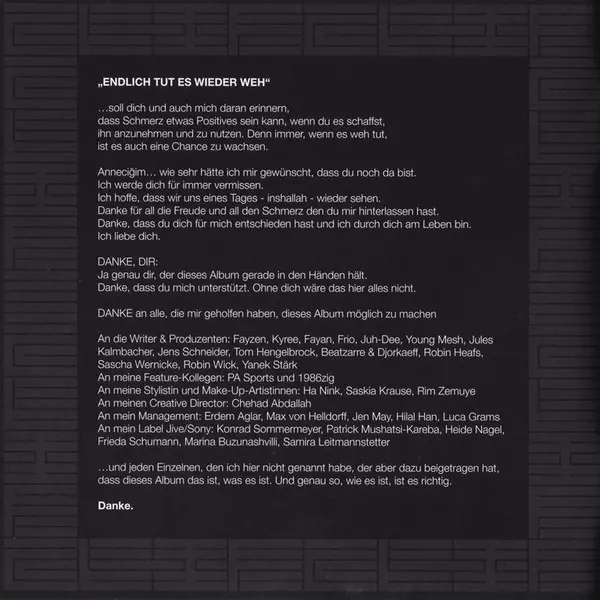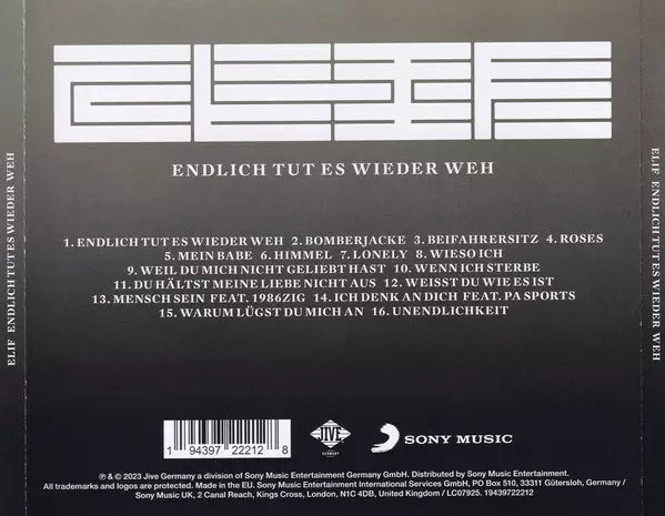 Elif: Endlich Tut Es Wieder Weh Wersja na CD w standardowe wydanie. Ta konkretna edycja została wydana w Europa w wydawnictwie Jive Germany we współpracy z Sony Music dnia 10. lutego 2023. Album sięga do gatunku Pop i Pop-Rap.
