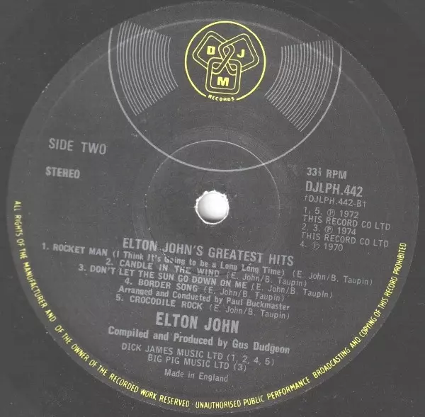 Elton John: Greatest Hits Wersja na winylu LP w standardowe wydanie. Ta konkretna edycja została wydana w WIELKA BRYTANIA w wydawnictwie DJM Records (2) dnia 4. listopada 1974. Album sięga do gatunku Rock, Pop i Classic Rock.